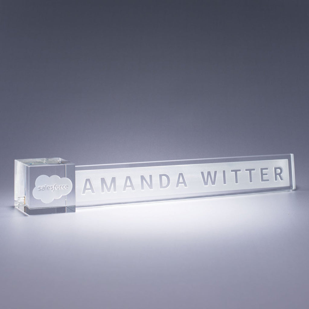 Keep it colorful! Our Accent Nameplate is available with a clear, blue, red or black cube, attached to a clear optic crystal nameplate that is angled for impact. Single color color-fill included at no extra charge.