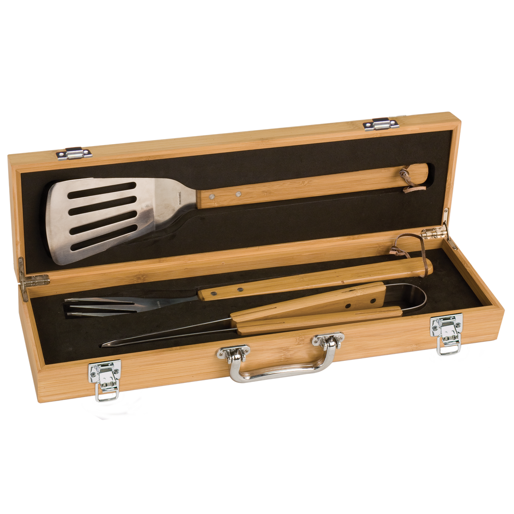 This premium BBQ gift set combines style, durability, and personal flair—perfect for grill enthusiasts. The tools are crafted from stainless steel for long-lasting performance while the handles and box are bamboo.