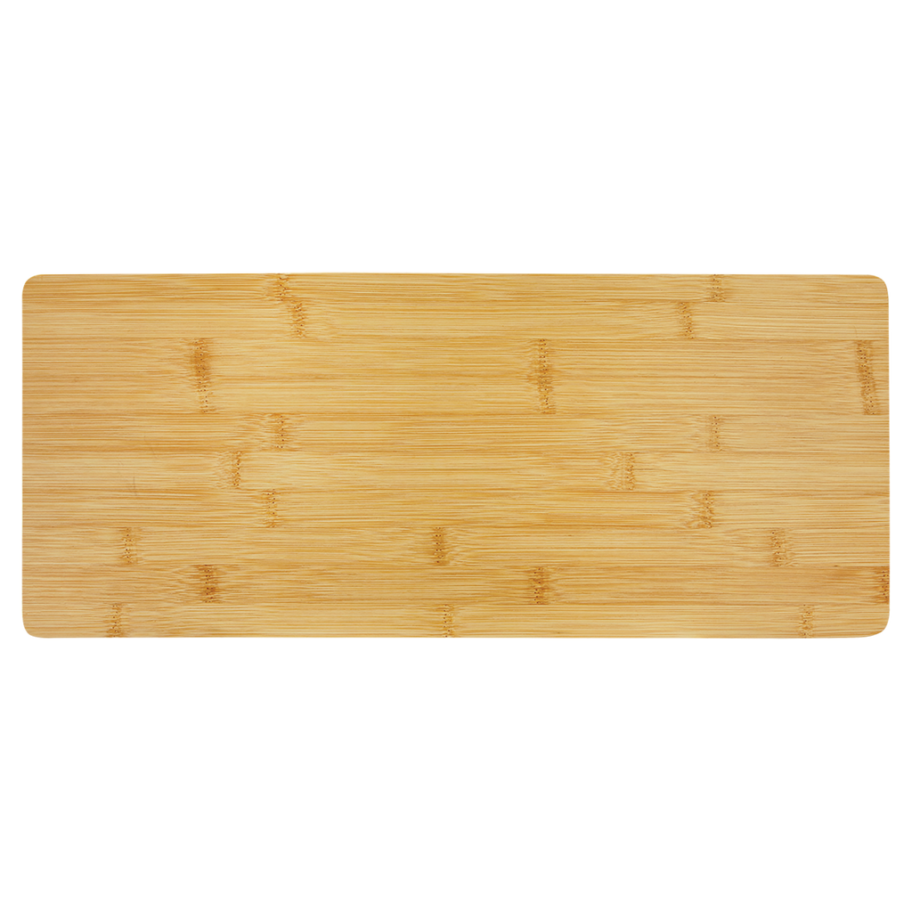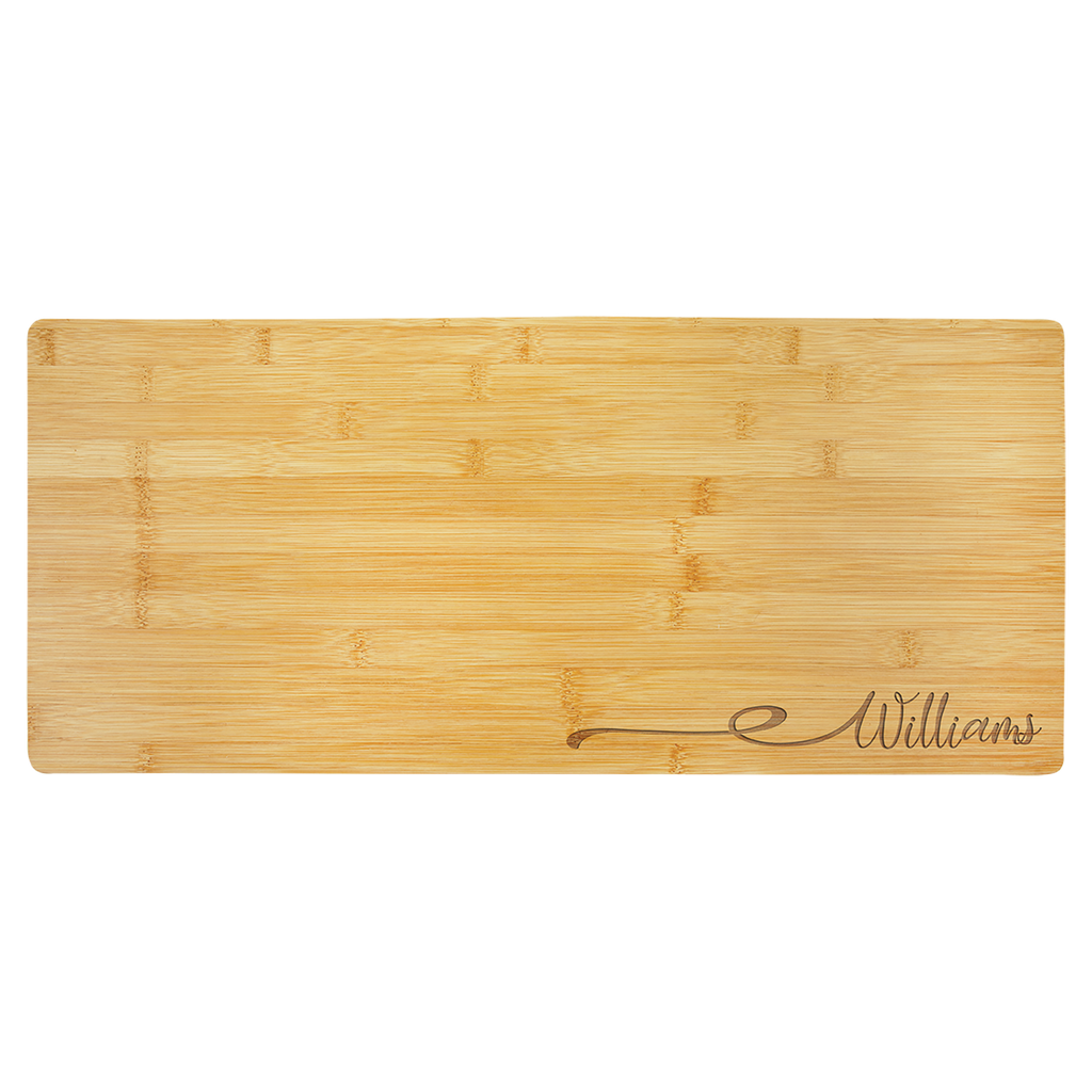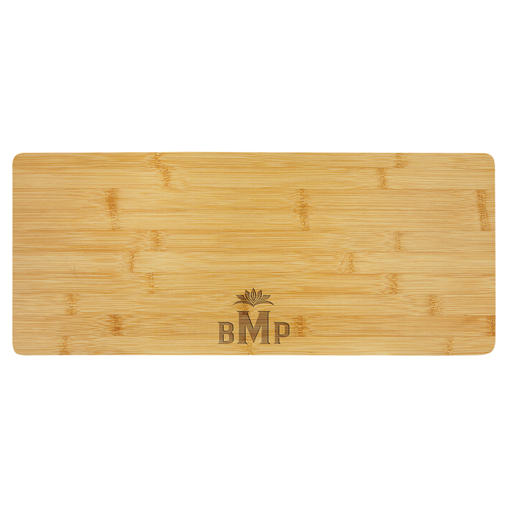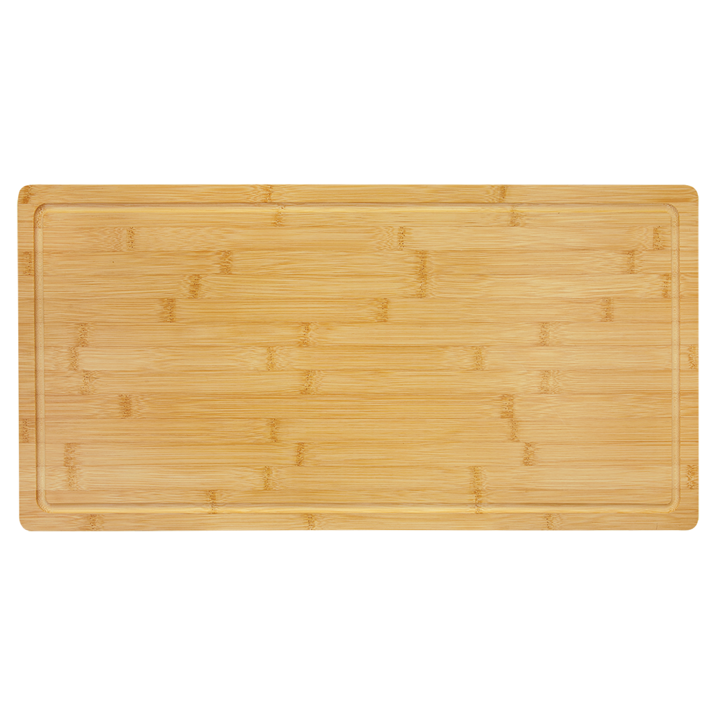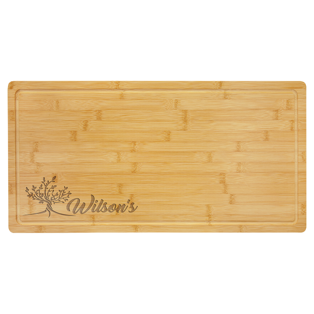 All natural bamboo serving boards perfect for charcuterie, veggies, or any other edible arrangement. Impress and entertain guests with these beautiful serving boards. Each board has routed out finger notches for easy carrying. The largest size comes with a drip ring for serving up juicy delights. Personalize your board with a laser engraved design to make it one of a kind.