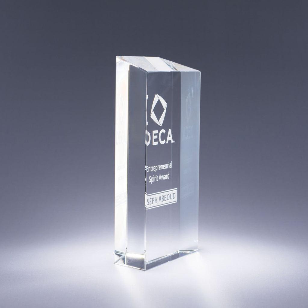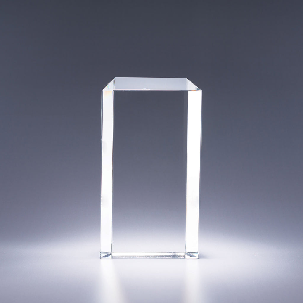 Sleek and modern sums up this beautifully simple optic crystal shape. The overlapping bevels add interest and a prismatic effect without losing its less is more quality. Excellent weight. Excellent value!