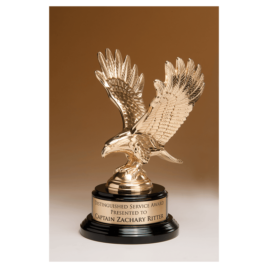 This exquisite gold finished eagle sculpture, mounted on a black piano finished base, serves as a distinguished award or gift symbolizing strength, freedom, and excellence.