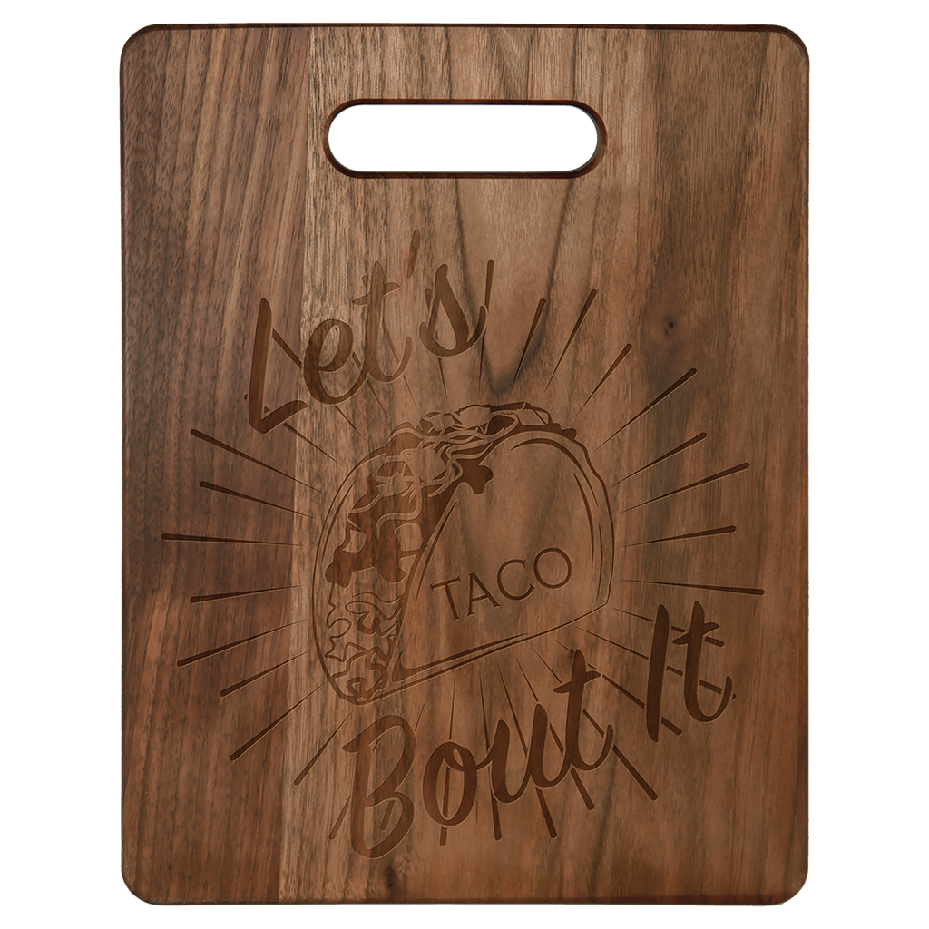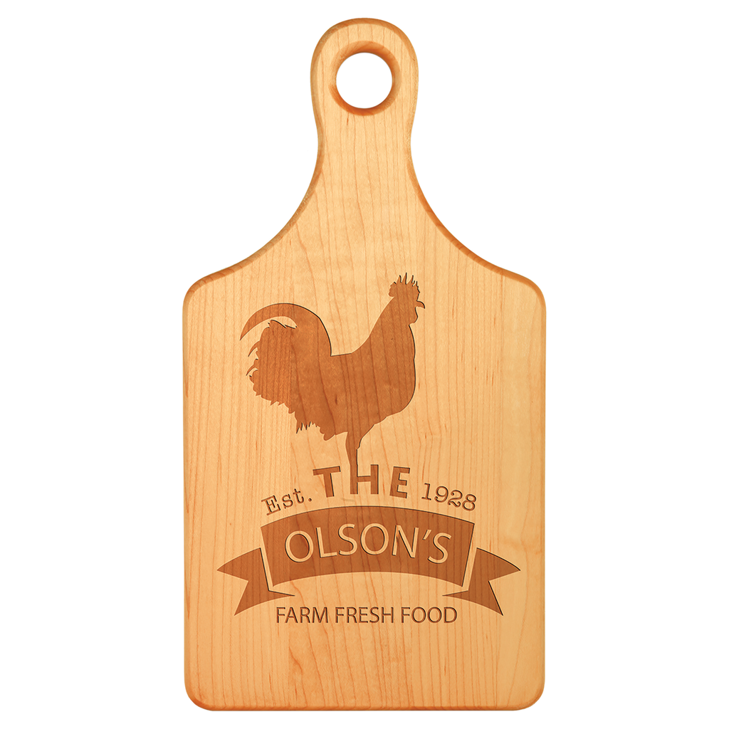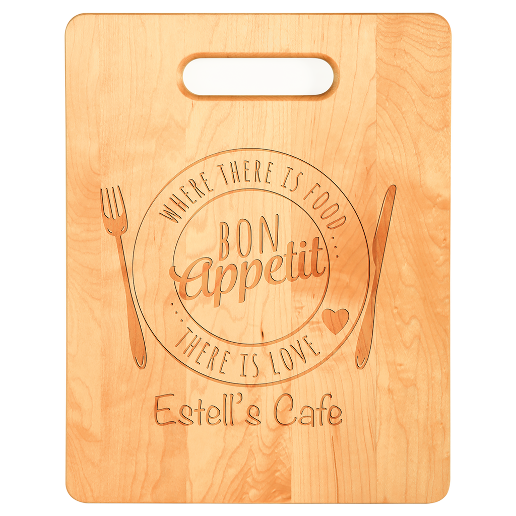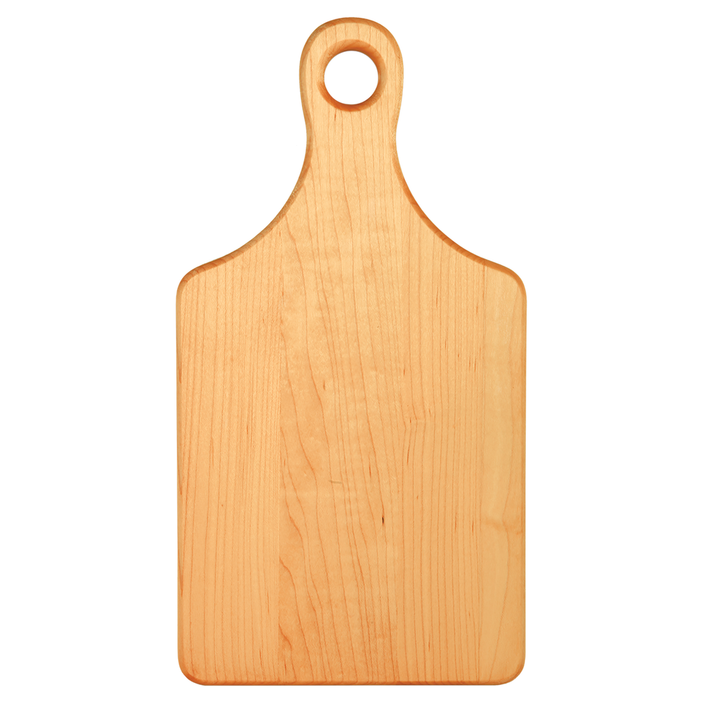 These all natural, 100% American made cutting boards are an essential addition to the chef in your life's kitchen. Each board has a handle for easy grabbing from the cabinet or hanging from a utility hook. The small board is 1/2" thick with all other sizes at 3/4" thick. Laser engrave your design to make it one of a kind.